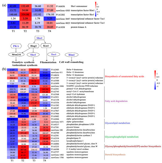 Heatmap analyses revealed that the DEGs in the longevity-regulating pathway and MAPK signaling pathway were significantly upregulated in the mycelia that were cultured for 4 days and then stimulated (T1 vs. T2). An opposite change in gene transcription of the transcriptional enhancer factor Tec1 was observed in mycelia cultured for 6 days (T3 vs. T4); however, other genes encoding the transcription factor RLM1, Sho1 osmosensor, protein kinase A, and another transcriptional enhancer factor Tec1 presented no obvious transcriptional changes (Figure 7a). The DEGs enriched in lipid metabolism according to the KEGG database were selected for analysis. The genes encoding delta-9 desaturase, delta-12 desaturase, and 3-oxoacyl-[acyl-carrier protein] reductase, which are related to the biosynthesis of unsaturated fatty acids in mycelia cultured for 6 days and then stimulated (T3 vs. T4), were significantly downregulated; however, the genes encoding phosphatidylserine decarboxylase, phosphatidylserine synthase 2, phospholipase D, and lysophospholipase I, which are enriched in glycerophospholipid metabolism, were significantly upregulated. Most genes encoding alcohol dehydrogenase, aldehyde dehydrogenase (NAD+), glutaryl-CoA dehydrogenase, acetyl-CoA acetyltransferase, and enoyl-CoA hydratase, which are involved in fatty acid degradation, were significantly downregulated in the mycelia cultured for 4 days and then stimulated (T1 vs. T2), whereas the genes involved in steroid biosynthesis, including C-4 methyl sterol oxidase and squalene monooxygenase, were significantly upregulated (Figure 7b).