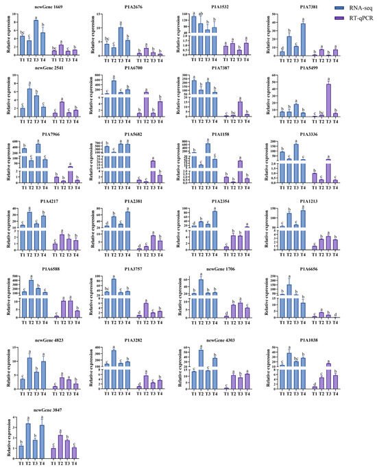 Gene expression validation of 25 DEGs by RT-qPCR. Different letters indicate significant differences between the groups (p < 0.05, according to Duncan’s test).