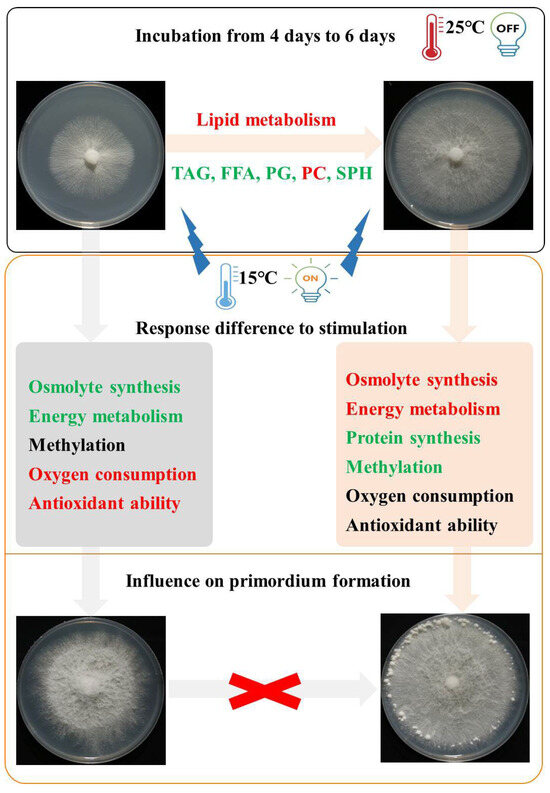 Schematic representation of the molecular mechanisms by which incubation time affects the primordium formation of P. tuoliensis. Triacylglycerol (TAG), free fatty acids (FFA), phosphatidylglycerol (PG), phosphatidylcholine (PC), and sphingosine (SPH). The red words in the box indicate the upregulated pathways. Green words indicate the downregulated pathways.