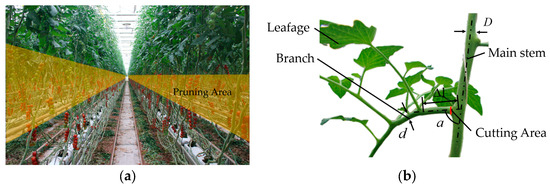 Modern greenhouse tomato production is characterized by industrialization, density, and standardization. As shown in Figure 1a, when tomato plants reach a height of 400–500 mm, tipping treatment is initiated to ensure the regularity and stability of subsequent growth. By regularly adjusting the inclination angle of the main stem through pruning, the height of the pruning and harvesting workspace can be maintained within the range of 1600–1800 mm, forming a pruning area.