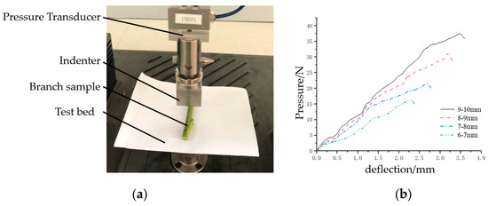 Branch compressive mechanics experiment. (a) Branch compression testing device. (b) Branch compression force curve of various diameter.