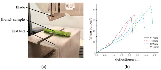 Branch cutting mechanics experiment. (a) Branch cutting testing device. (b) Branch cutting force curve of various diameters.