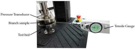 The universal testing machine manufactured by MTS SYSTEMS (CHINA) CO., LTD., Shanghai, China was utilized to measure the compressive properties. The MTS E43 electronic universal testing machine was equipped with two load sensors with ranges of 100 N (±0.30%) and 10 kN (±0.20%) to measure the compressive yield characteristics. The branch was placed on the testing platform (Figure 2a), and the indenter was set to move downward at a speed of 2 mm/s. When a decrease in pressure was detected on the branch (Figure 2b), it was concluded that the internal fibers were damaged. The pressure recorded at the moment of damage provided the minimum pressure required to cause compressive failure in branches of different diameters.