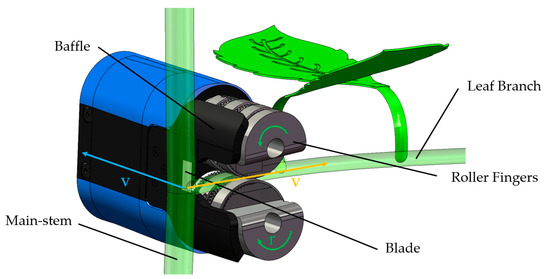 The cutting component is mainly composed of a side baffle plate and a blade. The side baffle plate is provided with a gap to facilitate the entry of the branch, and the blade is fixed at the gap of the baffle plate. After the friction and traction of the roller finger, the root of the lateral branch contacts the side baffle, and the lateral branch rotates in the spiral grove to the blade—the movement direction is shown by the blue arrow—and is pushed by the groove side until the blade cuts it. In order to ensure that the cut is as close as possible to the root of the branch when cutting, the branch should contact the baffle under the action of friction on the roller finger at the end. The branch should contact the blade under the action of traction—the movement direction of the branch is indicated by the orange arrow—so as to ensure the accurate positioning of the cut.