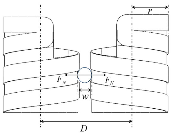 The two fingers are equipped with spiral grooves in opposite directions. During the rotation of the fingers, the side walls of the grooves exert a normal traction force on the branch, which acts as the reaction force to the shearing force applied by the blade. This force can be decomposed into a horizontal traction force and a thrust directed toward the blade, which should satisfy Equation (7).