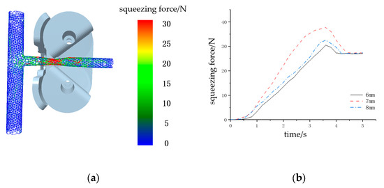 Figure 9b shows the pressure experienced by an 8 mm diameter branch during pruning operations under different finger gaps; the gaps between the roller fingers are set to 6 mm, 7 mm, and 8 mm, with roller fingers rotating in reverse at a speed of 5 rad/s. After passing through the pre-positioned grooves of the roller fingers, the branch enters the spiral grooves of the fingers. The compressive force initially increases, reaches a maximum point, then slightly decreases and stabilizes. When the gap between the roller fingers is between 6 mm and 8 mm, the compressive force exerted on the branch does not crush it, resulting in better gripping effects during rotation. Therefore, the selected range for the finger gap is appropriate.