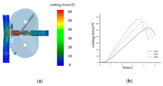 Branch cutting process simulation. (a) Cutting stress distribution. (b) Different diameter branch cutting stress variation curve.
