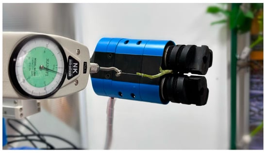Experiments were conducted on the pruning end-effector to verify the feasibility and practicality of the design plan. As shown in Figure 11, the first step involved using a force gauge to measure the radial pressure exerted by the end fingers of the pruning tool on tomato stems of varying diameters, as well as the pulling force directed away from the main stem. Next, a tie strap was used to connect the distal end of the test stem, away from the root, to a digital force gauge, which was fixed to the main body of the pruning end-effector. During the test, tomato branches positioned at the same distance from the base were placed in the grooves of the end fingers. Finally, a series of non-destructive clamping mechanical property tests were conducted on the tomato branch to measure the actual pulling force generated by the end fingers. The maximum value recorded by the digital force gauge was taken as the pulling force acting away from the main stem under the clamping action of the end fingers.