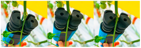 By conducting removal tests on branches of different tomato varieties, the adaptive positioning and non-destructive removal characteristics of the pruning end-effector in practical work are validated. The pruning end-effector was tested for its removal effectiveness. The end-effector, held manually, was used to prune branches within the designated pruning area, and the results were documented. To assess the actual working effectiveness of the pruning end-effector, the standards for pruning operations are unified: a successful removal is determined if the branch residue is within 5 mm and there is no damage to the main stem. Based on these evaluation criteria, field tests are conducted on the tomato pruning end-effector, as shown in Figure 12.