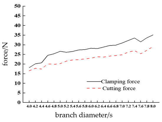 The statistical curve of the clamping characteristics of the end fingers for branches with diameters ranging from 4–8 mm is presented in Figure 13. The graph clearly shows that, within this diameter range, both the radial pressure and the pulling force exerted on the branch by the end fingers increase steadily as the branch diameter increases. For branches with diameters smaller than 4.6 mm, the elastic modulus is below the average value, and surface tissue detachment occurs, leading to slippage and a success rate lower than expected. Conversely, for branches with diameters larger than 7.2 mm, the tissue becomes more lignified, the elastic modulus increases, and effective clamping becomes more difficult. The end-effector performs optimally on branches with diameters between 4.4 mm and 7.2 mm, with experimental results consistent with the anticipated outcomes.