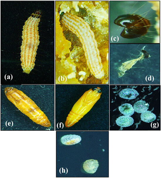 Different developmental stages of Ephestia cautella (Walker) (Lepidoptera: Pyralidae), reared on three different artificial diets for the evaluation of biological, reproductive, and morphometric parameters at 27 ± 2 °C, 65 ± 5% relative humidity with a 14L:10D photoperiod inside the climate-controlled growth chamber. (a) Male larvae; (b) female larvae; (c) head capsule; (d) shed exuvia with head and body of 5th instar larvae; (e) dorsal view of pupa; (f) ventral view of pupa; (g) hatched eggs; (h) unhatched and damaged eggs.