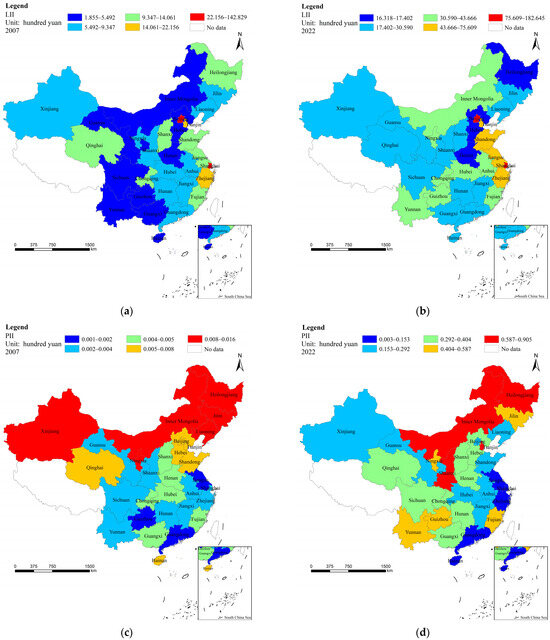 In order to explore the spatial distributions of the rural infrastructure and villagers’ income, this study selected two years, 2007 and 2022, and divided the variables into five categories using the natural breakpoint method. As can be seen from Figure 2a,b, regions in China with less LII presented a clear agglomeration pattern. In 2007, regions with less LII were concentrated in the southwest region of China and provinces such as Gansu, Inner Mongolia, Hebei, and Henan. In 2022, provinces with less LII were concentrated in Hebei, Henan, and Heilongjiang. As can be seen from Figure 2c,d, regions in China with more PII presented a clear agglomeration pattern. In 2007, regions with more PII were concentrated in northern provinces, such as Heilongjiang, Jilin, Liaoning, Inner Mongolia, and Xinjiang. In 2022, regions with more PII were concentrated in northern provinces, such as Heilongjiang, Inner Mongolia, and Shaanxi. As can be seen from Figure 2e,f, villagers’ income presented a clear agglomeration pattern. In 2007 and 2022, provinces with higher villagers’ incomes were concentrated in China’s eastern coastal areas, while provinces with lower villagers’ incomes were concentrated in the western regions of China.