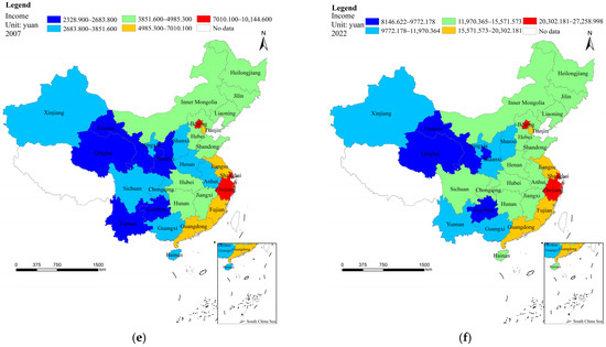 Spatial distributions of rural infrastructure investment and villagers’ income: (a) LII in 2007; (b) LII in 2022; (c) PII in 2007; (d) PII in 2022; (e) villagers’ income in 2007; (f) villagers’ income in 2022.
