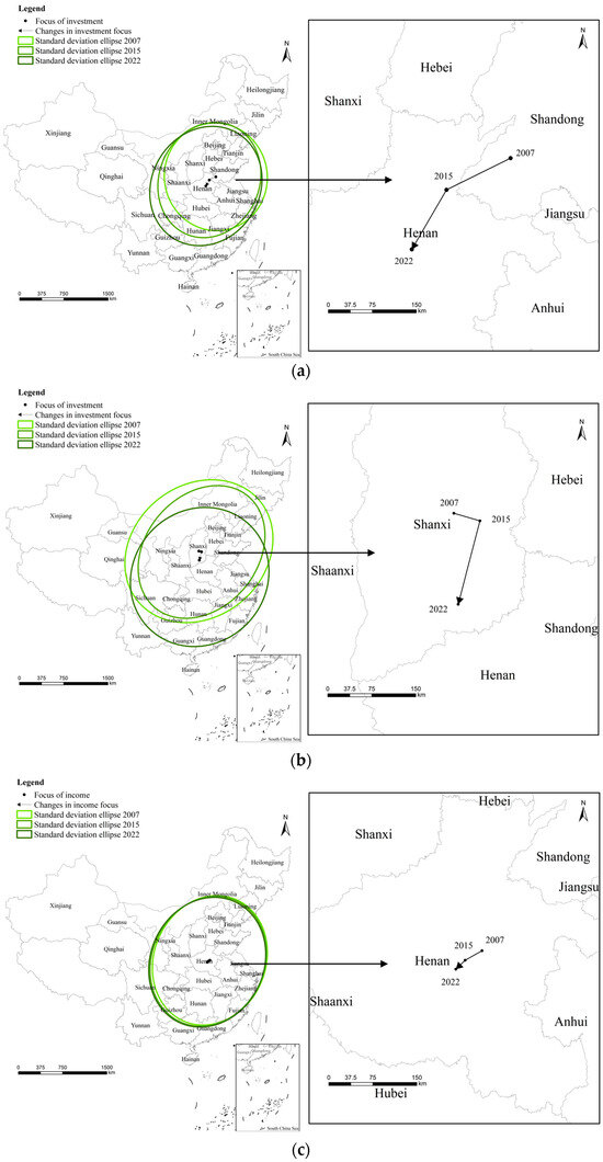 Focus and standardized ellipse diagrams: (a) LII; (b) PII; (c) villagers’ income.