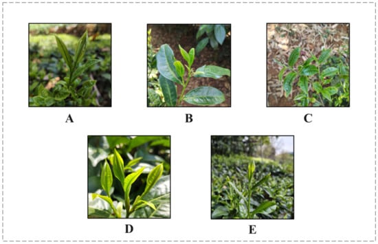 Sample images of tea leaves from different tea-plant varieties ((A) Changning Daye Tea; (B) Fo Xiang No. 3; (C) Xiang Gui Yin Hao; (D) Yun Kang No. 10; and (E) Yun Shan No. 1).