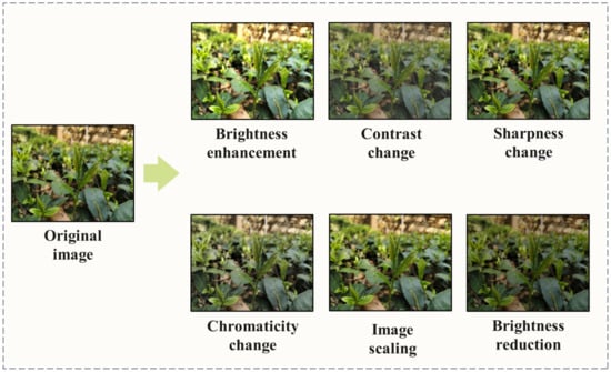 This study collected image data at the teaching and research base of the Tea Science College at Yunnan Agricultural University (Kunming, 102.75° E, 25.13° N, China). The Canon EOS R5 camera (Canon Inc., Tokyo, Japan) was used as the image acquisition device, and the image acquisition time was from March to April 2024. A total of 2400 fresh-leaf images from five tea-plant varieties were collected, including 490 of Changning Daye tea, 500 of Fo Xiang No. 3, 465 of Xiang Gui Yin Hao, 445 of Yun Kang No. 10 and 500 of Yun Shan No. 1. To ensure the quality of the model training dataset, a rigorous selection process was undertaken, resulting in the final selection of 2000 images as the original dataset. To enhance the network model’s recognition accuracy and generalization capability for different tea-plant varieties under real-world, complex environments, the images in the original dataset were augmented by changing brightness, chromaticity, contrast, sharpness and scaling [18], as shown in Figure 2. Following the augmentation process, a total of 12,000 images were obtained and annotated using Make Sense. The dataset was then randomly divided into training, validation, and testing sets in an 8:1:1 ratio, resulting in 9600 images for the training set, 1200 images for the validation set and 1200 images for the testing set. Specifically, each variety of tea leaves had 1920 images in the training set, 240 images in the validation set and 240 images in the testing set.