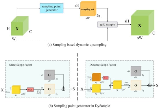 Assume a feature map of size , and a sampling set of size , where the first number 2 represents the coordinates of and . The grid_sample uses the positions in to resample the hypothetical bilinearly interpolated into of size , as shown in Equation (1). Simultaneously, an upsampling scaling factor and a feature map of size are set. A linear layer with input and output channel numbers of and is used to generate offsets of size . By pixel shuffling, the offsets are reshaped into ; at this point, the sampling set is the sum of the offsets and the original sampling grid , as shown in Equations (2) and (3).