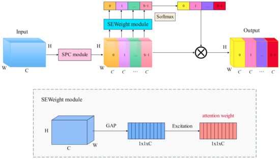As depicted in Figure 5, the PSA module obtains multi-scale feature mapping in the channel direction through the Squeeze Pyramid Concat (SPC) method. Utilizing the SEWeight module [26], it extracts attention from different scale feature maps, generating a channel attention vector. The Softmax function is then applied to recalibrate the attention vectors of each channel, yielding recalibrated weights for multi-scale channels. Finally, element-wise multiplication is performed between the recalibrated weights and the corresponding feature maps, resulting in a refined feature map with richer multi-scale feature information as output.