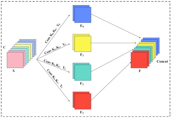 As shown in Figure 6, the key process for multi-scale feature extraction in the PSA module is SPC, which extracts spatial information from the input feature map through a multi-branch structure, obtaining richer positional information for the input tensor, and processes in parallel at multiple scales to obtain a feature map with a single type of kernel. At the same time, multi-scale convolutional kernels are used in the pyramid structure to generate different spatial resolutions and depths, and the channel dimension of the input tensor is compressed to effectively extract spatial information at different scales on each channel direction feature map, so that each differently scaled feature map has a common channel dimension and . However, as the size of the convolutional kernel increases, the number of parameters will be significantly improved. To handle input tensors of different kernel sizes without increasing computational costs, group convolution is introduced. The relationship between multi-scale kernel sizes and group sizes is shown in Equation (4), where is the kernel size and is the group size. The multi-scale feature mapping generation function is shown in Equation (5), where the -th kernel size , the -th group size is , and represents feature maps of different scales. Finally, the entire multi-scale pre-processing feature map is obtained through a concatenation method, as shown in Equation (6), where .