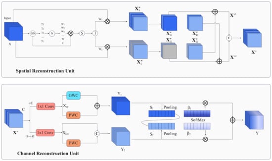 SRU and CRU module structure. The upper part of the picture depicts a Spatial Reconstruction Unit, the lower part of the picture depicts the Channel Reconstruction Unit.