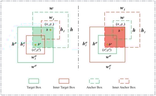 In the task of bounding-box regression (BBR), the IoU loss [33] accurately describes the degree of matching between the predicted box and the ground truth (GT) box, ensuring that the model can effectively learn the positional information of the object. As shown in Equation (16), and represent the predicted box and the GT box, respectively.