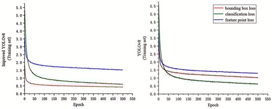 Loss functions are crucial metrics for measuring the convergence performance of a model and are instrumental in directing the training and optimization processes. A lower loss-function value signifies a closer alignment between the model’s predictions and actual outcomes, implying more precise predictive capabilities and enhanced generalization ability [37]. When training the improved YOLOv8 model and the original model under the same conditions and parameters, as shown in Figure 9, the improved YOLOv8 model shows a faster initial decline in the loss function during the training process. After approximately 100 epochs, the rate of decline in the loss function begins to slow down, and the curve becomes stable. By the end of 500 training epochs, the loss function of the improved model reaches a steady state, with the bounding-box loss, classification loss and feature point loss eventually stabilizing near 0.4, 0.6 and 1.5, respectively. Compared to the original YOLOv8 model, the bounding-box loss has decreased by 58%, the classification loss has decreased by 3% and the feature point loss has increased by 16%. Therefore, the improved YOLOv8 model clearly outperforms its predecessor.