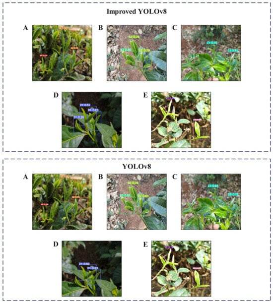 Comparison of detection effects before and after the improvement of YOLOv8 ((A) Changning Daye Tea; (B) Fo Xiang No. 3; (C) Xiang Gui Yin Hao; (D) Yun Kang No. 10; and (E) Yun Shan No. 1).