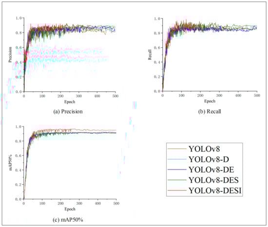 To evaluate the effectiveness of different improvement modules on the performance optimization of the YOLOv8 network, this study conducted ablation experiments to test the optimization effects of different improvement strategies, with the results shown in Table 2. As indicated in the table, the incorporation of DySample resulted in a 2% boost in the model’s recall. The integration of the EPSANet structure into the backbone network led to improvements of 2.3% and 0.2% in recall and mAP50, respectively. The addition of the SCConv module to the Neckbone, the model’s precision increased by 1.4%. Ultimately, the improved YOLOv8 model achieved increases of 7.1%, 3.9% and 3.4% in precision, recall and mAP50 compared to the original model. Although the improved model has a slightly increased number of parameters and overall model size, with a 19.8% increase in parameters and a 1.3 MB increase in model weight, it still maintains the lightweight characteristics of the original model, and its performance is superior to other verified models. Figure 11 shows a comparison of the precision, recall and mAP50 performance curves for the five network models used in the ablation experiment. The ablation experiment confirms that the network model improvement optimization of the YOLOv8 network can enhance the original model’s detection performance for the target. These results indicate that by effectively improving and optimizing modules, the detection performance of the model can be significantly enhanced without sacrificing the lightweight characteristics and detection speed of the original model.