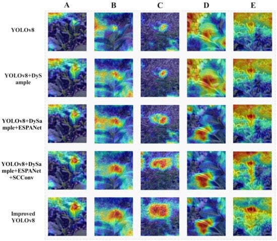 To comprehensively assess the model’s performance, this study utilizes Gradient-weighted Class Activation Mapping (Grad-CAM), a technique designed to visualize the model’s critical focus areas for its predictive decisions. This visualization tool is instrumental in elucidating the rationale behind the model’s predictions [38]. Figure 12 illustrates the effectiveness of various improvements to the YOLOv8 model in visualizing heatmaps of attention across different tea-plant varieties. The intensity of colors in the heatmaps represents the degree of focus the model directs towards specific regions, with darker shades indicating a higher level of attention. The results demonstrate that the YOLOv8 model is capable of focusing on the primary feature areas of tea leaves, although there are instances of misclassification and missed detections. The introduction of DySample refines the model’s attention, concentrating it more on the edges and shape features of the tea leaves. The incorporation of EPSANet leads to a more evenly distributed attention, and the further implementation of SCConv enhances the focus on key identification areas of the tea leaves. The comprehensively improved YOLOv8 model exhibits deeper coloration in the heatmaps for predicted targets, indicating a heightened focus on regions of interest within the images. This results in an optimal distribution of attention, accurately highlighting the most discriminative areas of the tea leaves.