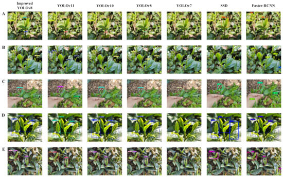 To further verify the advantages of the improved YOLOv8 model in detection performance, this study conducted comparative experiments with other prevalent object-detection models, including YOLOv11, YOLOv10, the original YOLOv8, YOLOv7, SSD and Faster-RCNN; the results are shown in Table 3. Compared with YOLOv11, YOLOv10, YOLOv8, YOLOv7, SSD and Faster-RCNN, the improved YOLOv8 model has increased precision by 3.6%, 10.8%, 7.1%, 7.9%, 9.3% and 22.4%, respectively. Similarly, recall increased by 4.0%, 14.6%, 3.9%, 14.6%, 6.3% and 14.8%, respectively, while mAP increased by 3.5%, 8.2%, 3.4%, 13.8%, 9.9% and 19.4%, respectively. In the model comparison experiment, the traditional two-stage object-detection model Faster-RCNN exhibited lower recognition accuracy, with more network parameters and slower training speed. Conversely, the single-stage object-detection models, particularly the improved YOLOv8, showcased enhanced recognition accuracy and training velocity. The improved YOLOv8 model achieved precision of 88.4%, recall of 89.9% and mAP of 94.8%, fully meeting the needs of real-time detection. As shown in Figure 13, different models were tested for detection effects using test-set image data. For the five types of tea-plant fresh leaves selected in the experiment, the improved YOLOv8, YOLOv11, YOLOv10, YOLOv8 and YOLOv7 can all accurately identify the targets with little difference in their confidence scores. SSD had situations where the target was not detected, and its confidence scores are slightly lower. Faster R-CNN’s detection results have good confidence scores, but there are cases of detection errors. In terms of detection speed, the improved YOLOv8, YOLOv11, YOLOv10 and YOLOv8 were the fastest, followed by YOLOv7, whereas SSD and Faster-RCNN were the slowest.