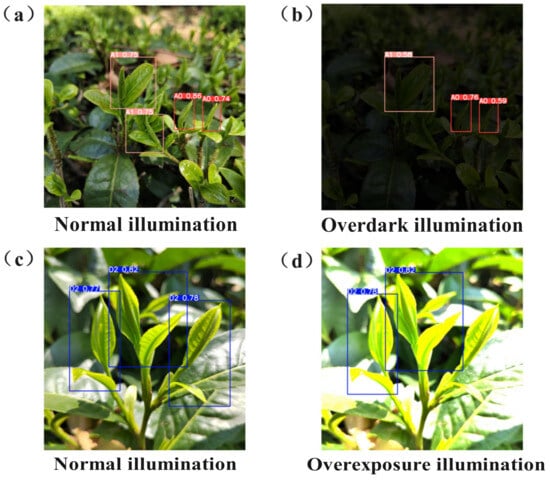Comparison of recognition results of improved YOLOv8 model under extreme lighting conditions: (a,c) indicates the recognition result of the model under normal illumination, (b) indicates the recognition result of the model under over-dark illumination, and (d) indicates the recognition result of the model under overexposure illumination.