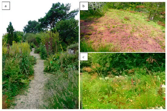 Proposal of an eco-border shown in the Botanical Garden in Vienna in 2020 (a), a xero-garden shown in Floriade, 2022 (b), and an eco-garden in Trompenburg, Netherlands (c). All would be pollinator friendly and resistant to drought while simultaneously exhibiting aesthetic values.