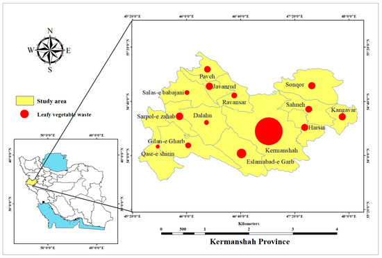 The research was conducted in Kermanshah, a province in western Iran with a population of approximately 2 million (1,952,434 people) residents and an area of 25,045.4 square kilometers (see Figure 1) [66]. This region has one of the largest amounts of waste from green vegetables [14]. Within the research region, there are between 800 and 1000 hectares of annual leafy vegetable cultivation, with each hectare yielding about 65 tones of crop annually. The LVSC of all those products consists of four key stages: production (farmers), marketing (retailers and wholesalers), processing (processors), and consumption (food services and households).