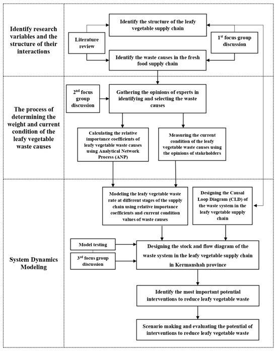 Nevertheless, FLW remains extremely high in Iran, where vegetables have the highest rate of agricultural FLW (42%) [12]. In Kermanshah, a major agricultural hub in Iran, significant annual waste of leafy vegetables results from supply chain (SC) inefficiencies, including perishability, production challenges, inadequate marketing infrastructure, and poor consumer management [13,14]. Given population growth and related challenges, addressing FLW and implementing effective interventions is crucial. Recent research has mostly focused on managing FLW and its environmental and economic impacts rather than prevention. Some notable approaches in this regard include a life-cycle assessment [15], cost––benefit analysis [16], and multi-objective optimization methods [17]. Despite offering strategies for waste reduction, these studies have not thoroughly examined or quantified the specific impact of interventions on FLW [18]. To address this gap, this study aims to create a framework using System Dynamic Modeling (SDM) to assess the effectiveness of interventions in reducing waste in the leafy vegetable supply chain (LVSC) in the Kermanshah province. Leafy vegetables are categorized as green vegetables and include celery, spinach, leeks, mint, parsley, watercress, and coriander, which are commonly consumed in Iran as the main meal (cooked) and dessert. As lettuce and cabbage have distinct SCs compared to other green vegetables, they were not incorporated in this research study. To achieve its main goal, this research addresses four questions: (1) How is Kermanshah’s LVSC structured, and which areas should waste reduction interventions (WRIs) target? (2) What are the main factors influencing waste in each LVSC area? (3) Which WRIs are most significant? (4) How much waste do they reduce? The study covers leafy vegetable loss and waste from pre-harvest to consumption, using “leafy vegetable waste (LVW)” to describe discarded food.