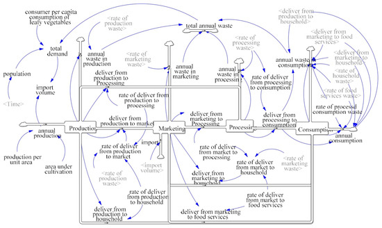 Stock and flow diagram of the waste system in the leafy vegetable supply chain [14].