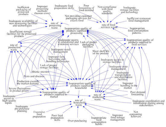 Causal loop diagram of a waste system within the leafy vegetable supply chain [14]. Note: (+)—Strengthening; (−)—Weakening.