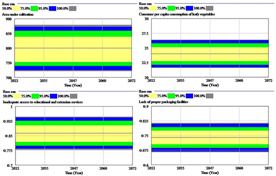 After it has been developed, the model needs to be validated. Expert judgments and specific tests like sensitivity analysis were utilized for this goal. To verify and validate the model in SDM, two categories of behavioral and structural tests are used [72]. The model was structurally and behaviorally tested using a sensitivity analysis test. The behavior of other model variables is examined concerning changes in variables and which values can be changed under real-world circumstances. To do this, during the sensitivity analysis phase, the values of model constants were modified between +10 and −10, and the system output values were assessed. Figure 6 displays the results of the sensitivity analysis for the four key research variables at four different modification levels (50%, 75%, 95%, and 100%). These variables were chosen based on the advice of experts and how sensitive the model was to changes in them. According to these results, the model is reliable because its outcomes are sensitive to changes in the inputs.