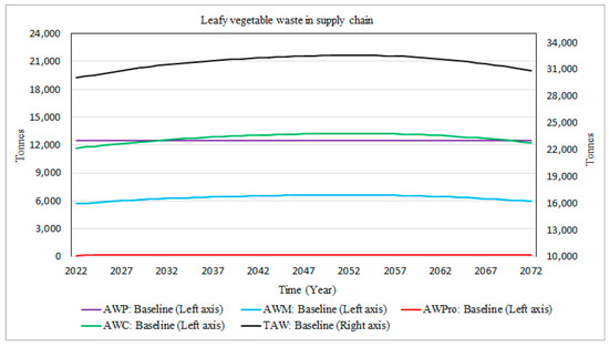 This run simulates the waste generation at various points along the LVSC during the simulation period. According to the findings, an estimated 31,000 tonnes of leafy vegetables are discarded annually across the SC. The three stages of production (12,500 tonnes), consumption (12,300 tonnes), and marketing (5700 tonnes) contribute the highest amount of wasted mass (Figure 7).