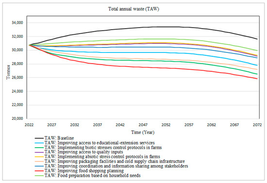 After formulating the model and confirming its validity, it can be put into practice. The simulation was carried out in two steps. Initially, a baseline simulation was performed to calculate the current volume of waste and its trend during the simulation period. Then, the impact of interventions on waste reduction was evaluated.