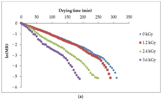 The curves of ln(MR) as a function of drying time for various irradiation doses and temperatures are shown in Figure 5. The data points generally align with a linear fit, although slight deviations from the straight-line behavior occur, particularly towards the end of the drying process. These deviations likely result from uneven moisture distribution within the mushroom slices, changes in product temperature during drying, and shrinkage formation [62]. The R2 value for these linear fits range from 0.95 to 0.99, which indicates a high degree of correlation between ln(MR) and drying time.