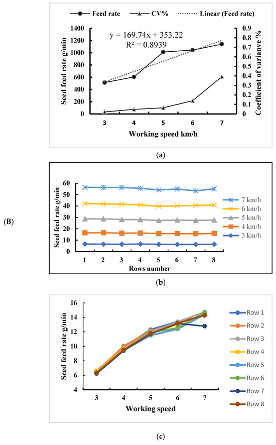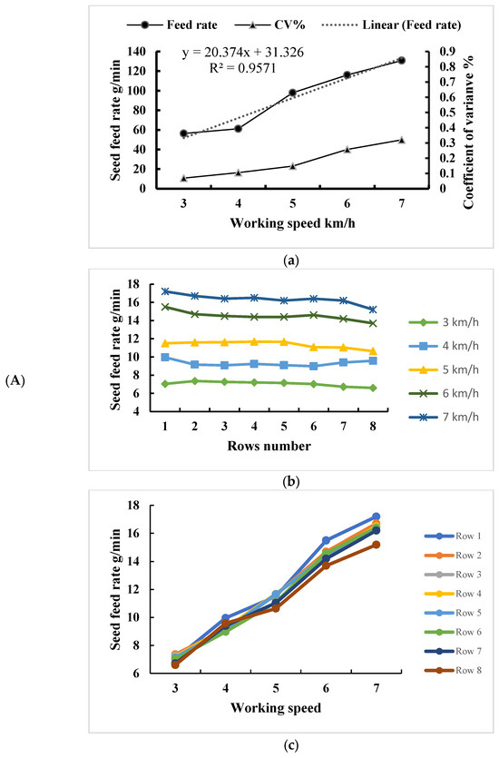 Seeding performance of CADSD for RWR. (A) Rapeseed seeding performance. (B) Rice seeding performance. (C) Wheat seeding performance. (a) Total seed feed rates and coefficient of variation with respect to the working speed of the hole wheel; (b) Comparison of seed feed rates of each row; (c) Variations of seeding feed rates of each row with respect to the working speed of the hole wheel.