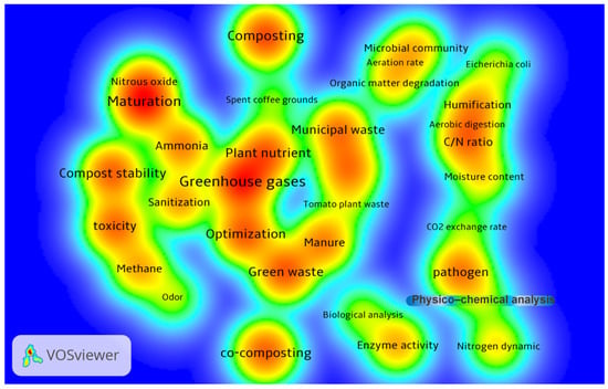 In addition to the insightful keyword analysis, Figure 3 showcases a density visualization map that further emphasizes the significance of specific elements. Each point on the map is color-coded, denoting the density of elements at that specific location, ranging from shades of blue and green to hues of red and yellow. Points closer to the red and yellow spectrum indicate higher weights and a greater number of neighboring elements, while points closer to green and blue signify fewer elements in the vicinity. This visualization significantly underscores the importance of key aspects related to the composting process, composting objectives, monitoring parameters, and composting advantages, elucidating them as hot topics of discussion within the scope of this study.