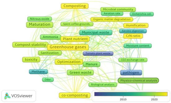 To gain insights into the temporal dimension of research in composting management, Figure 4 presents a visually informative representation of the results, complemented by a color bar indicating the year of publication.