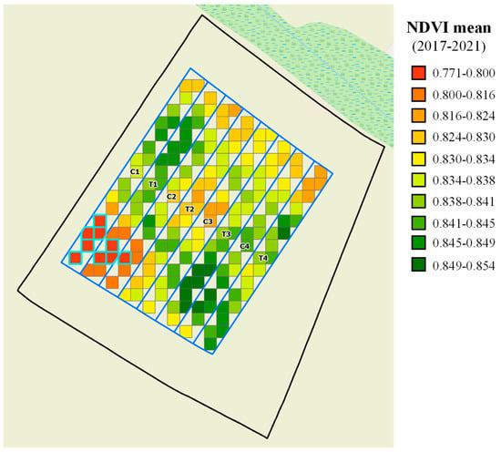 Average NDVI mean values with natural breaks coloring method, using 80% overlapping (Experimental Site I). Light blue polygon outline color shows the lower average NDVI values (below 0.8). C1–4 indicate control plots; T1–4 indicate Trichoderma-treated plots.