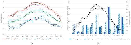 Monthly weather data of the experimental years 2022 and 2023. (a) Average, minimal and maximal temperatures. (b) Monthly average of solar radiation and precipitation.