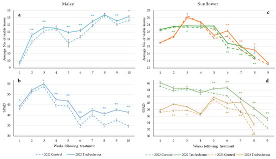 To evaluate the impact of treatment on photosynthetic potential, the number of viable (green) leaves was determined, and SPAD values were measured. Maize plants treated with Trichoderma spp. exhibited significantly increased leaf viability, with the effect becoming apparent as early as two weeks after the foliar application and persisting throughout the growing season (Figure 4a). The application of Trichoderma spp. to sunflower plants significantly increased viable leaf numbers, thereby stimulating plant development and prolonging leaf longevity. A statistically significant increase in leaf number was detected three weeks after treatment in 2023 and five weeks after treatment in 2022. This positive effect of Trichoderma spp. on leaf development and viability was maintained until the end of the vegetation period (Figure 4b).