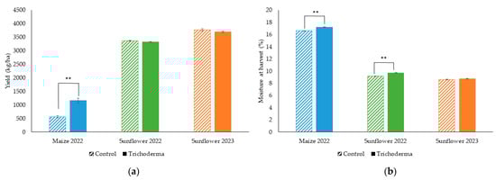 Average yield (a) and average moisture content of harvested seeds (b) of maize and sunflower plants treated with Trichoderma spp. compared to untreated controls. Error bars represent standard error. **: t-test p < 0.001.
