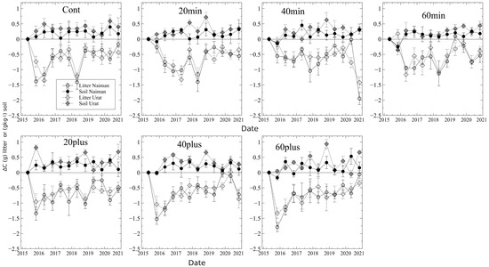 First, dynamic derived-litter soil C buildup was controlled mainly by differences in soil properties (as most variation was associated with the site effect) and secondarily by the variation in precipitation (Table 1). The driest site, Urat, had the largest soil C baseline and dynamic buildup derived from litter (Figure 1 and Figure A2). This is because the soil type in Naiman is classified as sandy soil [32] (equivalent to aeolian sandy soils, according to the Chinese Genetic Classification [33]) while that in Urat is classified as gray desert soil [34]. A key difference between these soils is the poorer soil development and higher proportion of sand in the Naiman aeolian soils and the higher clay/silt proportion in the type of soils in Urat. Thus, it seems that the higher dynamic C buildup in Urat was mainly controlled by the differences in soil texture and soil development. Lu compared a number of different soils in arid and semiarid areas in Inner Mongolia and found that, on average, the top soils of the gray desert soils had higher C and N contents than those of the aeolian soils, and such differences could be partially explained by soil texture (i.e., a positive effect of the soil clay/silt fraction on soil C and N) [34]. Yet, these two soil types were still on the poor nutrient side of the gradient among the different soils studied by Lu [34]. This points to the fact that, even when considering the poor C levels in our study areas, soil colloids or other soil mineral-fraction-related mechanisms influence the absorption of C and N litter-derived compounds, something that has been long discussed for more mesic areas [35]. Similarly, in a study of C and N mineralization in three soils in the Black Land Prairie region of Texas, soil type was the primary factor controlling the relative contribution of litter C to soil C mineralization [36], which is similar to the results obtained for the arid and semiarid areas considered in this study. On the other hand, the negative effect of precipitation on the dynamic soil C buildup was mainly apparent in the driest precipitation treatment of −60% (Figure 1), which coincided with the reduction in the C-derived litter observed in our long-term experiment [21]. This points to a potential negative effect of the reduction in litter-derived C in response to extreme drought events in arid and semiarid areas on soil C accrual [37].