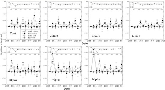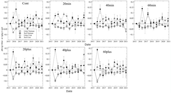 Controls (i.e., factors we either manipulated or measured) of the dynamic nutrient buildup (Δi) varied depending on the nutrient in question (Table 1). In general, time did not have a significant effect on any nutrient, indicating that the average amount of nutrients incorporated into the soil did not show a strong diminishing trend (Figure 1, Figure 2, Figure 3 and Figure 4). Yet, there were quite a few significant interactions involving time (see below). Most of the variation in dynamic C buildup was accounted for by between-site differences, with a higher mean dynamic buildup in Urat. Precipitation also had a significant effect on the dynamic C buildup (with particularly slower accumulation under the −60% treatment). The interaction of precipitation × time indicated the fact that the level of dynamic C buildup per treatment varied widely among the sampling dates. Sites differed only marginally for dynamic N buildup, with Naiman having a higher overall dynamic buildup. However, most of the variation was in the interaction of site × time as, for Naiman, the highest dynamic N buildup occurred early in this study, particularly in the precipitation surplus treatments. This coincided with the high N released from the litter (Figure 2). For dynamic P buildup, the sites differed marginally (Urat showed a higher overall dynamic buildup), and the effect of precipitation was significant (+40% higher and −60% lower). However, the significant precipitation × time interaction revealed a wide variation in dynamic P buildup among the precipitation treatments over the duration of this study. Most of the variation in dynamic P buildup was accounted for by soil temperature (it increased with temperature). High P contents in the soil occurred early in the litter decomposition stage (Figure 3), coinciding with high P releases from the litter. Finally, for dynamic K buildup, sites also differed marginally, with Naiman having higher overall values. The significant precipitation × time interaction indicated that the buildup varied widely among treatments over the duration of this experiment. As with P, most variation in the dynamic K buildup was related to soil temperature (it increased with soil temperature).