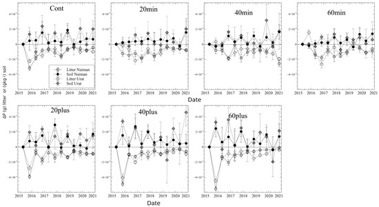 Finally, the last group of soil nutrients, in terms of what controls their dynamic buildup, included P and K. For these nutrients, soil temperature was the main controlling factor; however, they were also responsive to site differences and precipitation treatments (Table 1). Both the baseline K and P contents were much higher in Naiman than in Urat, and such differences point to site-specific pedogenic processes as the main cause of the differences in their baseline values (e.g., a main difference in parent materials or depositional loads between the sites). However, the dynamic P buildup was higher in Urat (suggesting a similar textural explanation as for C and N; see above) but higher in Naiman for K. Nonetheless, the dynamic buildups of P and K in the soil were mainly controlled by soil temperature (Table 1), as their rates increased as the soil temperature increased. In fact, the dynamic K and P buildups, unlike those of C and N, presented very striking seasonal oscillations, with peaks of accumulation in the sampling dates after summer and minimum to null accumulation rates in the sampling dates shortly after winter (Figure 3 and Figure 4). In the same experiment, Qu observed that temperature had a significant effect on the mass loss of P and K from litter, suggesting that their buildups in soil (as observed here) are mediated by microbial activity [21]. However, whereas temperature also affected the N mass loss from litter [21], it did not affect its dynamic buildup in the soil. This suggests the microbes controlled the K, P, and N input from litter (see below, as K presented particular trends), but microbes only controlled the dynamic buildups of P and K.